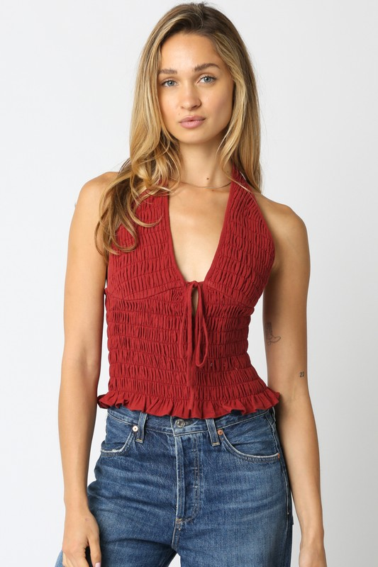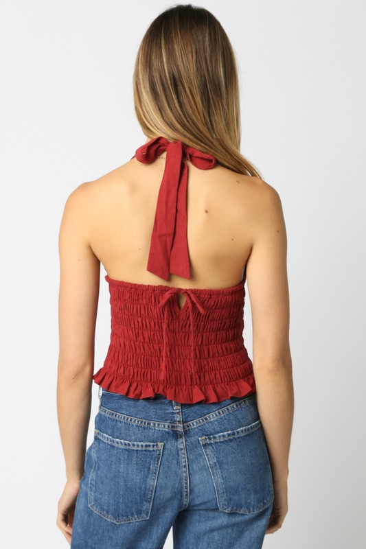 Featuring a mulberry ribbed tied halter top with ruffle trimming