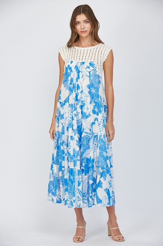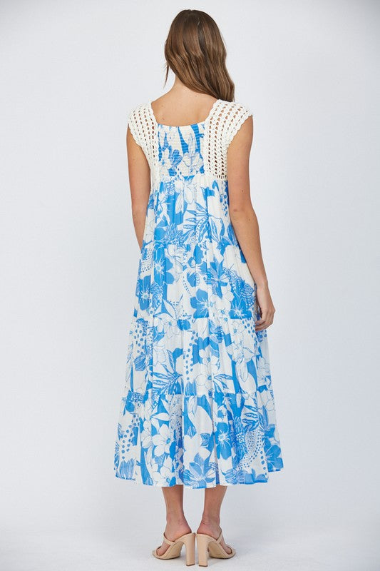 Featuring a crochet top maxi dress with blue and white floral print