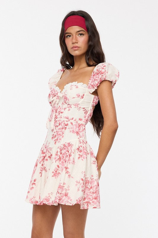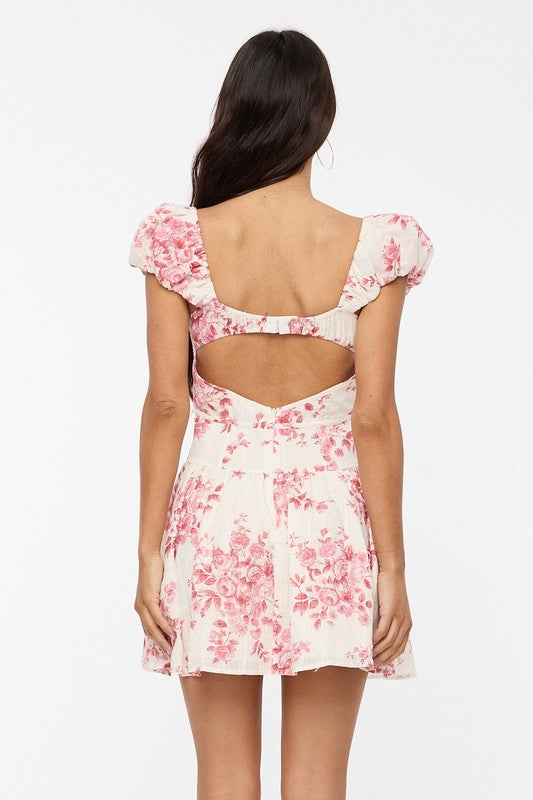 Featuring a pink and white floral mini dress with sweetheart neckline and puff sleeves